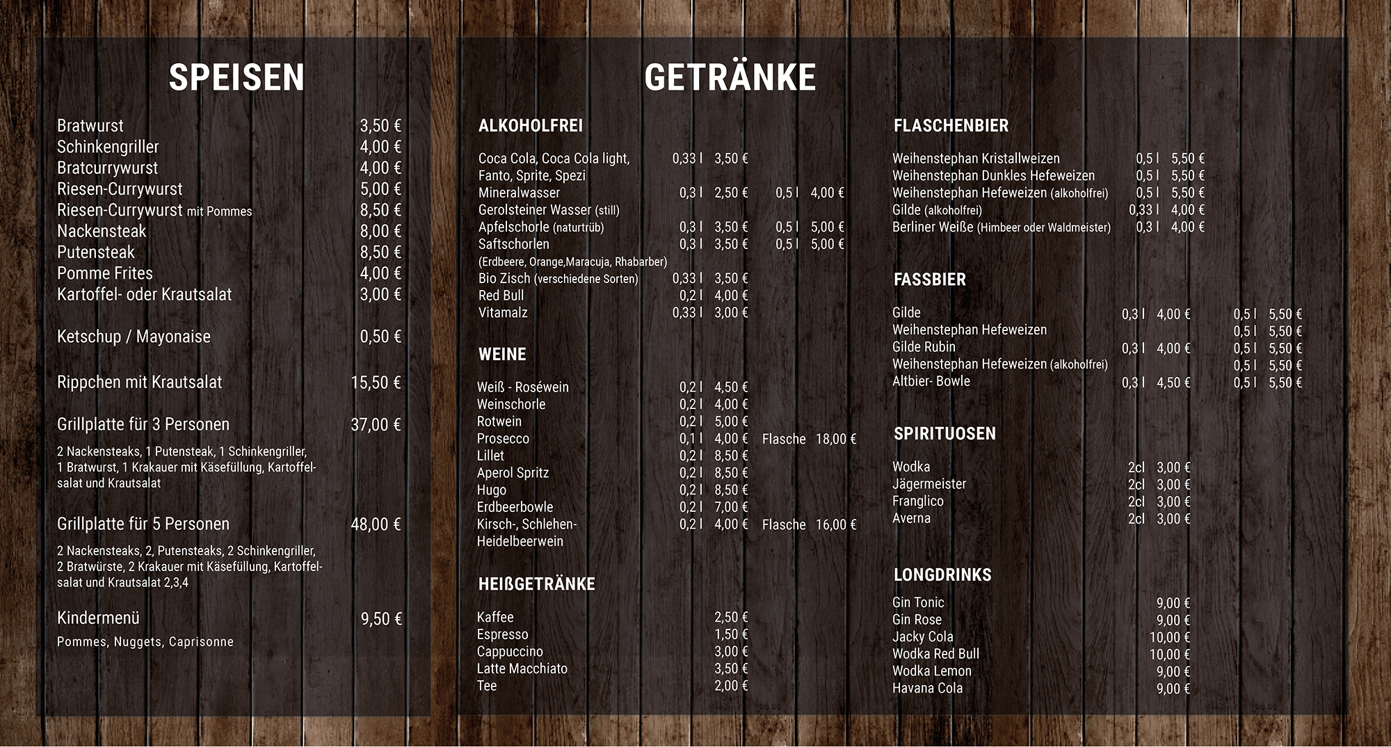 Unser Biergarten bietet Platz für bis zu 300 Personen und ist bei schönem Wetter geöffnet. Bei schlechtem Wetter haben wir eine überdachte Terrasse, auf der Sie dennoch im Freien sitzen können.